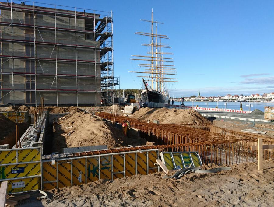 Die drei von eins:eins geplanten Wohngebäude des ersten Bauabschnitts am Priwall in Travemünde nehmen Gestalt an.