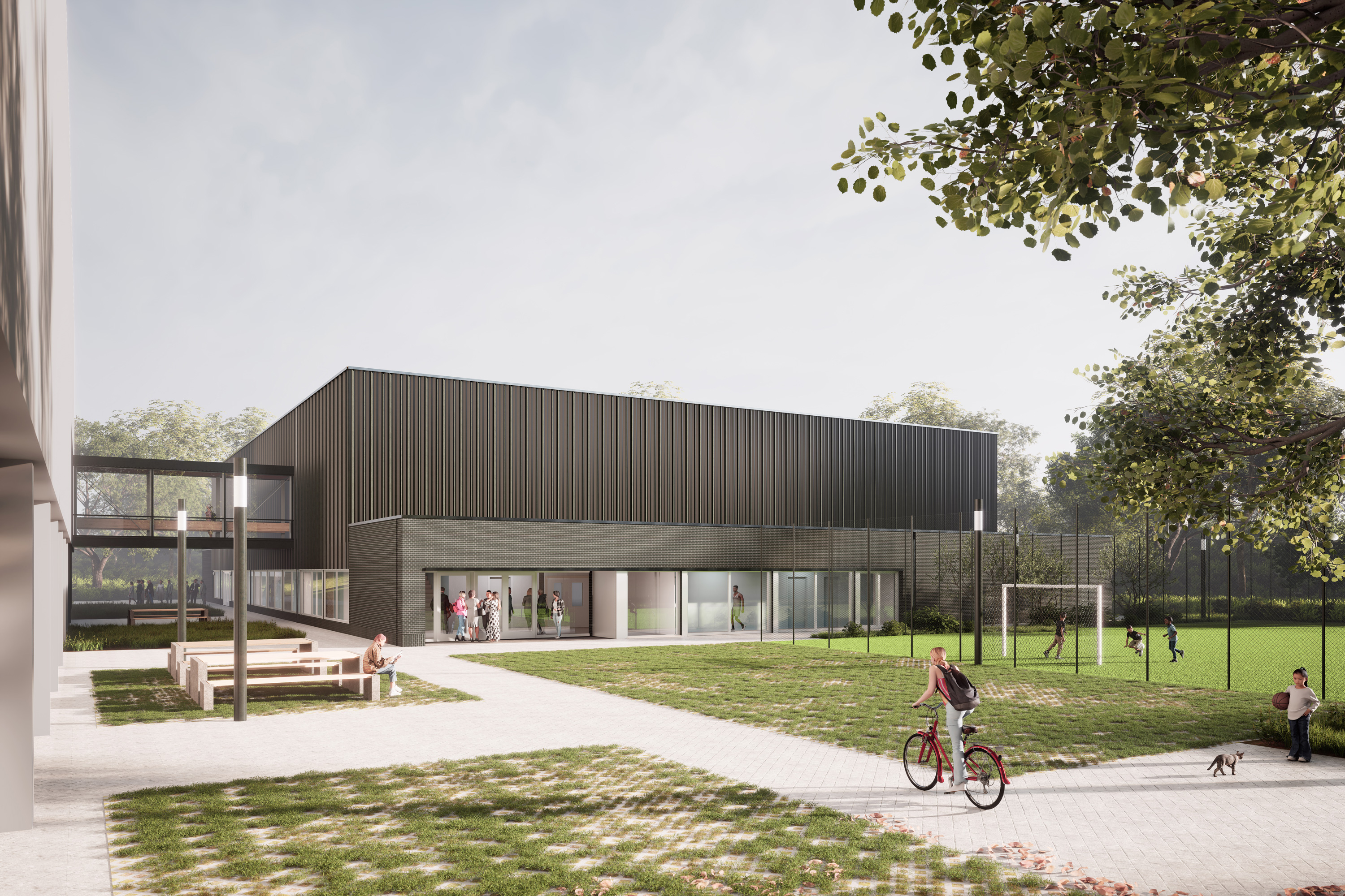 Eine Sporthalle wird für die zukünftige Schulnutzung errichtet. Mit dem Denkmalschutzamt wurde vereinbart, die technische Versuchshalle des Bestandes abzubrechen, und dieses Baufeld für die erforderliche 3-Feld-Sporthalle zu verwenden.