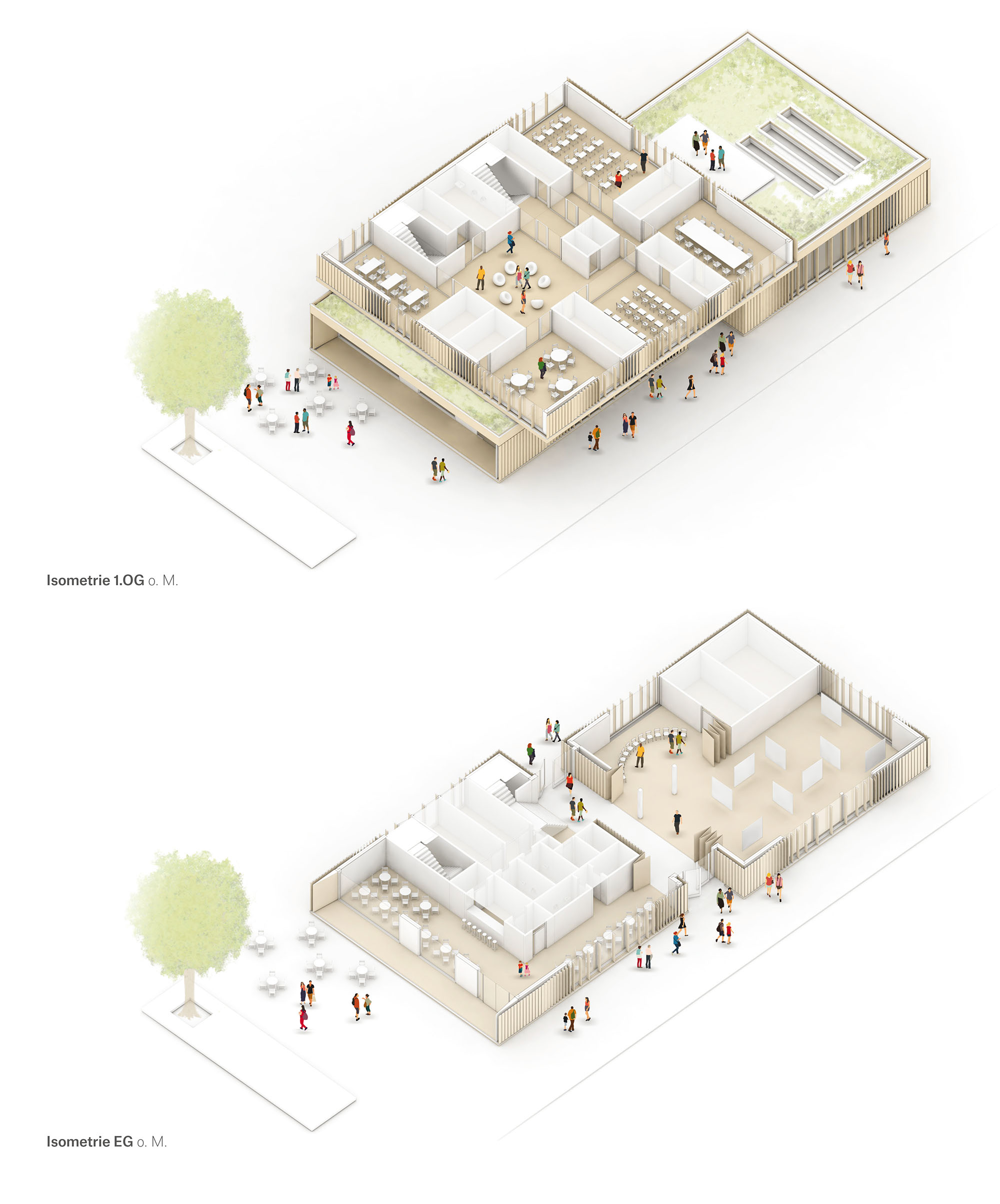 Die Begegnungszonen bilden jeweils das räumliche Zentrum im 1. und 2. Obergeschoss. Hier ist Raum und Möblierung für informelle Treffen, Kleingruppenarbeit und Entspannung. Über die teilweise verglasten Trennwände und Oberlichter werden die Flächen natürlich belichtet, und es entstehen vielfältige Sichtbeziehungen nach außen. Zusätzlich steht auf dem Dach über der Campusgalerie eine Dachterrasse allen Nutzern zur Verfügung. In dem südlichen erdgeschossigen Bauteil ist das Café L-förmig um die dienenden Räume angeordnet. Es öffnet sich über eine großzügige Verglasung zum Vorplatz und zur Straße. Vom Foyer aus ist das Café auch innerhalb des Gebäudes direkt zu erreichen. Die Campusgalerie kann über mobile Trennwände zum Foyer und zu Musikraum großflächig geöffnet werden, so dass eine fließende Raumabfolge entsteht. Oberlichter ermöglichen eine gleichmäßige Belichtung mit Tageslicht. Der zentrale Musikraum liegt im Erdgeschoss und kann für Aufführungen zur Galerie geöffnet werden. Die übrigen Musikräume liegen gebündelt in einem eigenen Cluster im 2. OG. Die Seminarräume bilden mit ihren Nebenräumen einen Cluster im 1. OG. Sie sind ringförmig um eine Begegnungszone angeordnet. Der Konferenzbereich ist separat erschließ- und nutzbar und hat einen Zugang zur Dachterrasse. Die Bewegungsräume bilden mit ihren Nebenräumen und Umkleiden einen Cluster im 2. OG. Sie sind ebenfalls ringförmig um eine Begegnungszone angeordnet. An den Decken werden bereichsweise Schienen für die Aufhängung von therapeutischen Schaukeln u.ä. vorgesehen. Einzelne Wände werden vollflächig verspiegelt, und mit Vorhängen versehen. Die Büroräume im Erdgeschoss werden direkt über das Foyer erschlossen. WC-Kerne sind auf alle Geschosse verteilt. Im EG verfügen die Galerie und das Café über getrennte WC-Kerne.