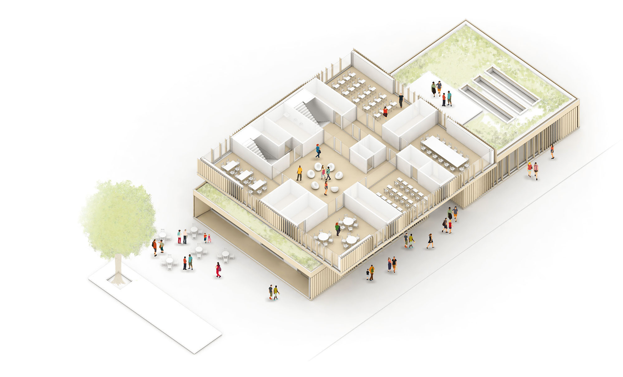 Die eingeschossigen Bauteile des Gebäudesockels vermitteln zu der flachen Bebauung der Nachbarschaft und den eingeschossigen Gebäudeteilen der Schule. Auf diesen ruht ein zweigeschossiger Bauteil, der über seine Höhe und bereichsweise Auskragung die städtebauliche Lage akzentuiert. Die erdgeschossigen Bauteile sind zueinander versetzt angeordnet, um so von beiden Gebäudeseiten auf den Haupteingang zuzuleiten und bereits am Vorplatz mit einer Einlenkbewegung auf den Eingang hinzuweisen. Das Foyer zwischen den Bauteilen ist von der Schule und aus dem öffentlichen Straßenraum gleichermaßen zugänglich. Die Gebäudeauskragungen schützen die Eingänge.